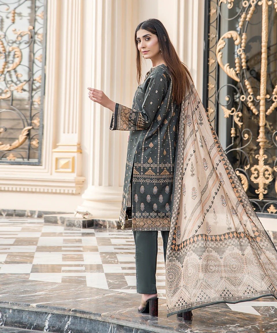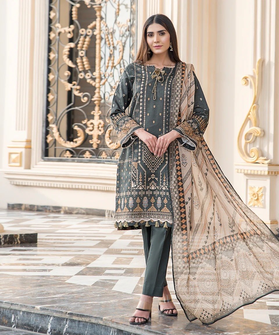 The collection features two stunning color palettes: a vibrant Deep Teal with coral accents and a sophisticated Charcoal Grey with earthy gold motifs. The shirt is adorned with high-definition digital prints that highlight ethnic geometry and floral patterns. To elevate the look, the set includes a Digital Printed Fancy Dupatta that adds a luxurious drape and a refined finish to your ensemble. Complete with a matching Lawn trouser, this set offers total freedom for custom stitching, whether you prefer a classic long kameez or a modern short-shirt silhouette.