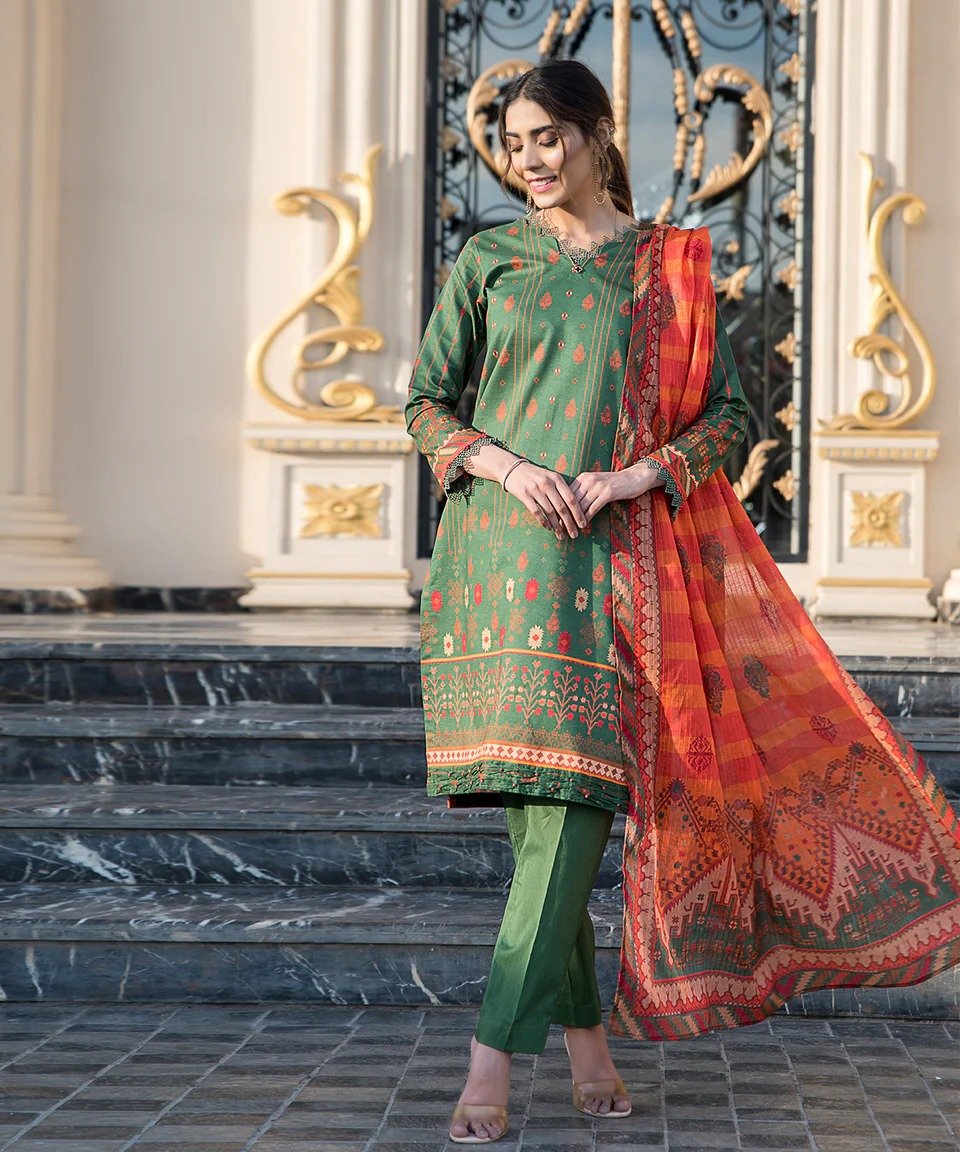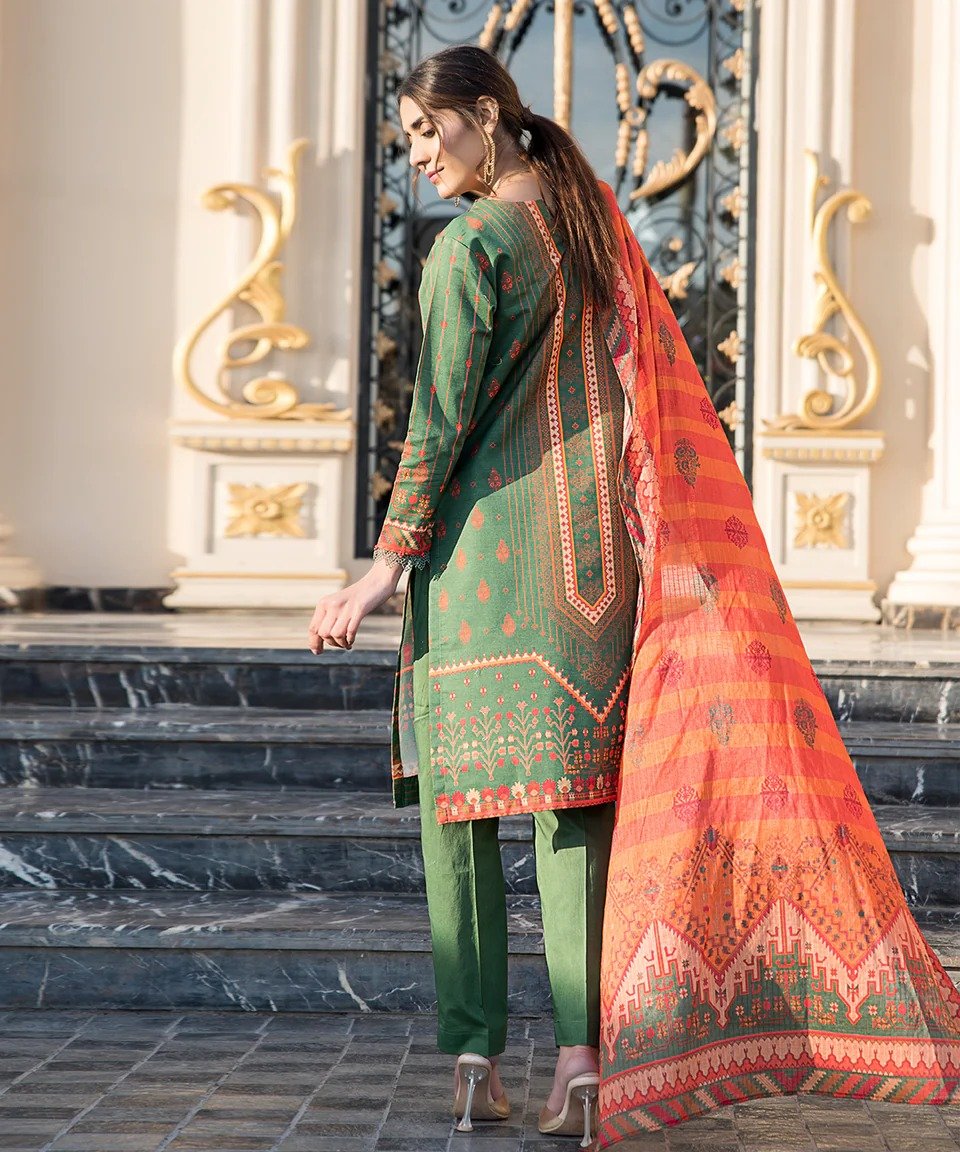 The set is elevated by a Digital Printed Fancy Dupatta that adds a touch of luxury and grace to the overall silhouette. Paired with a matching Lawn trouser, this unstitched set gives you the creative freedom to design your outfit exactly how you want it—whether it’s a classic long kameez, a trendy short shirt, or stylish cigarette pants.