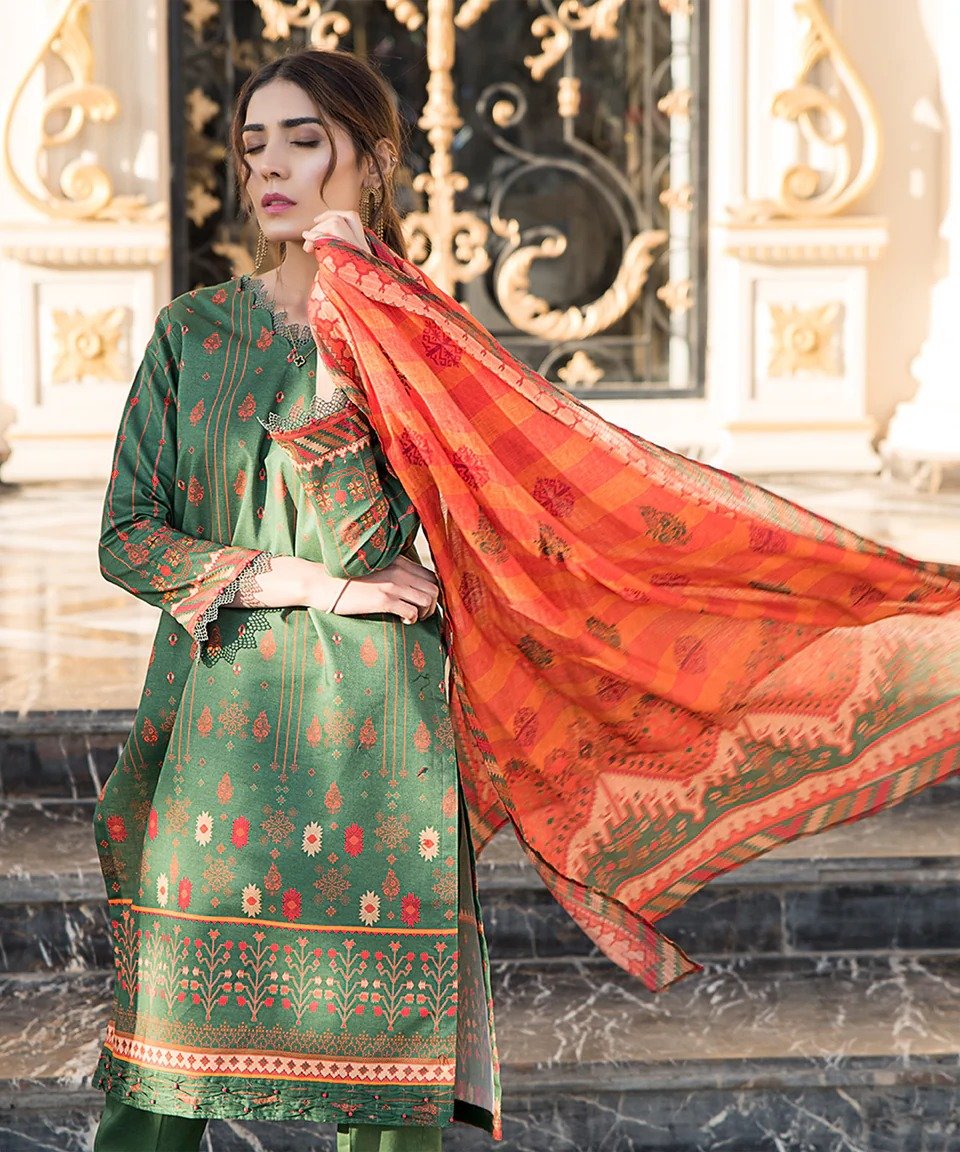Forest Green: Offers a vibrant contrast with warm orange and red patterns, paired with a striking shaded dupatta.