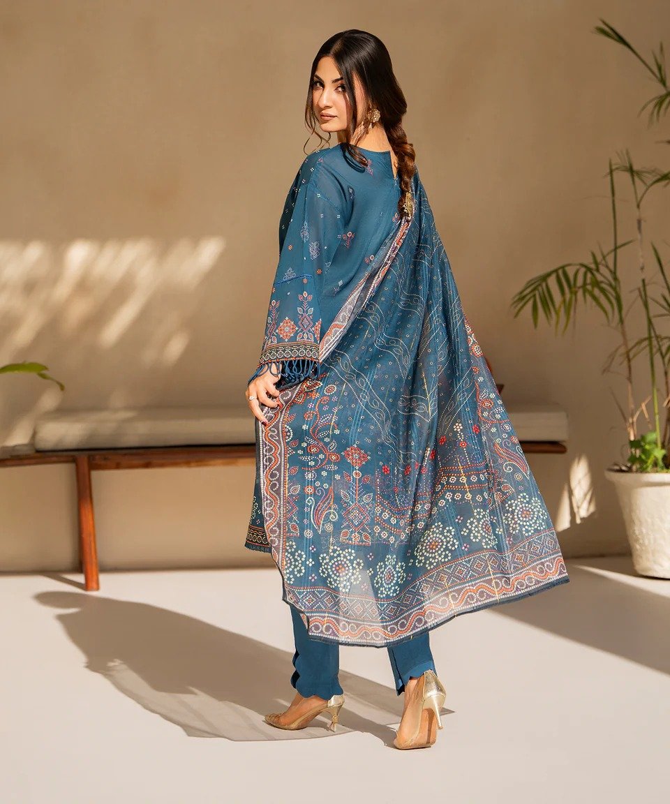 The outfit is paired with a Digital Printed Fancy Dupatta, adding a touch of sophistication and grace to the overall silhouette. Completing the set is a matching Lawn trouser that ensures breathability and ease of movement throughout the day. Whether it’s a casual office day or a family gathering, this multicolor teal-toned suit allows you to customize the fit to your unique style.