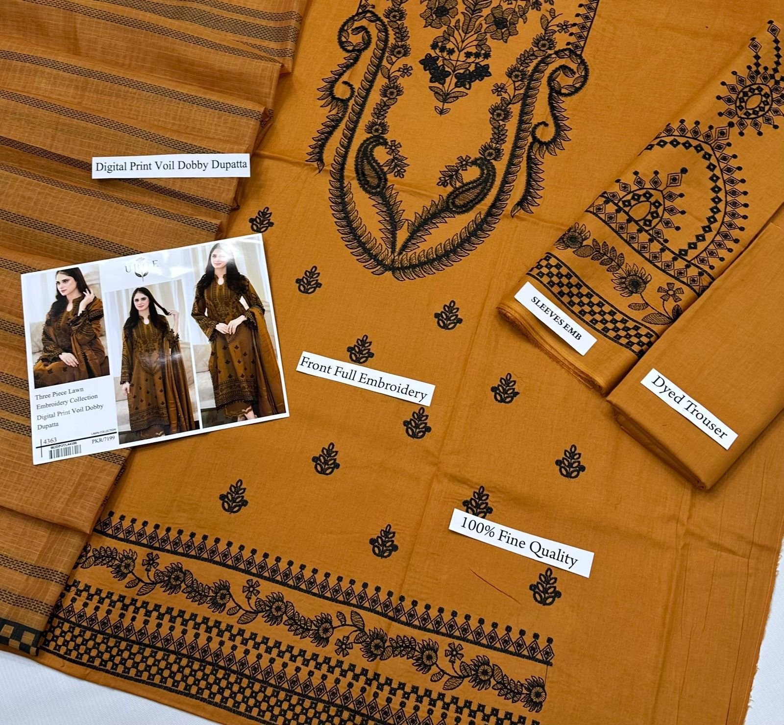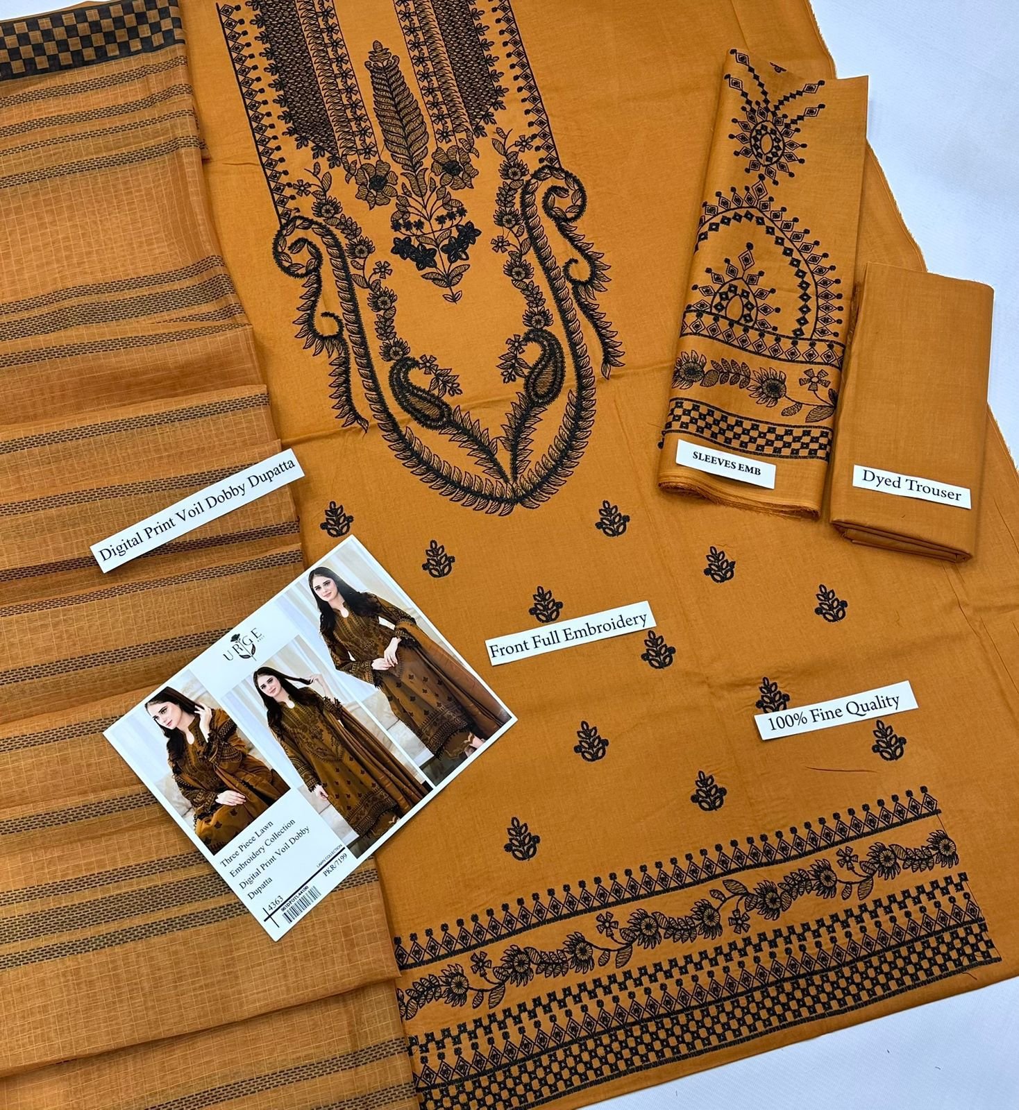 Upgrade your summer wardrobe with this beautifully crafted unstitched embroidered lawn 3-piece suit, designed for elegance and comfort. The premium lawn shirt features heavy embroidery on the front, creating a refined and eye-catching look. The fully embroidered sleeves enhance the richness of the design, while the plain dyed back keeps the overall silhouette balanced and breathable.